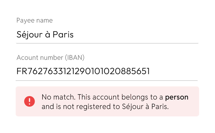 The IBAN and name do not match. Please contact the person you wanted to pay to and verify the payment information.
